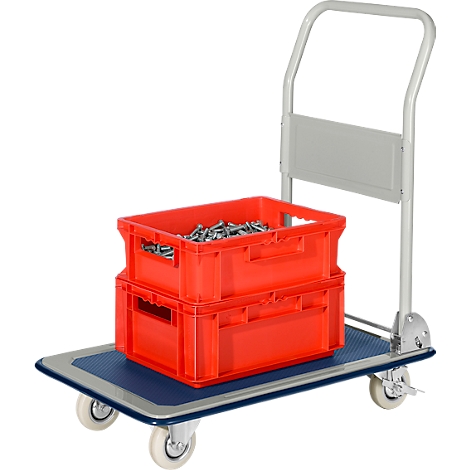 Chariot plate-forme, avec poignée rabattable à 90°, L 740 x l. 480 x H 860 mm, capacité de charge 150 kg, roulettes avec freins, acier, gris/bleu