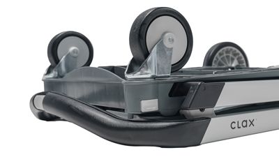 Équipé de pneus pleins sur des jantes en plastique, le mobile pliant CLAX® offre une mobilité maximale, même en franchissant des marches. Les roues indépendantes avec deux roues pivotantes et deux roues fixes assurent une conduite stable. De plus, les roues peuvent être retirées en un tour de main et rangées dans la plateforme au sol pour un gain de place.
