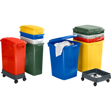 Vielseitig einsetzbare Abfallbehälter aus robustem Polypropylen. Behälter und Deckel sind separat in jeweils verschiedenen Farben erhältlich. Behälter und Deckel bitte separat bestellen. Die Deckel liegen nur lose auf, ein Scharnier ist als Zubehör erhältlich. Einfach ideal, um sie zu einer individuellen Sortieranlage zu kombinieren. Die glatten Oberflächen innen und außen lassen sich leicht reinigen. Alle Behälter sind mit handgerechten Tragegriffen ausgestattet, stapelbar und können zusätzlich mit einem praktischen Fahrwagen ergänzt werden. Als Zubehör ist außerdem ein Verbindungsset für die Fahrwagen erhältlich.