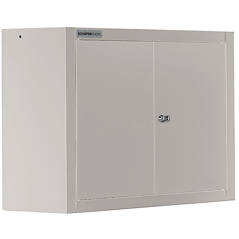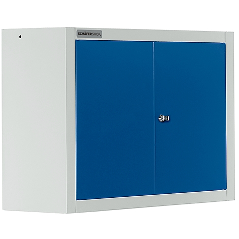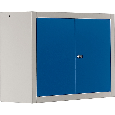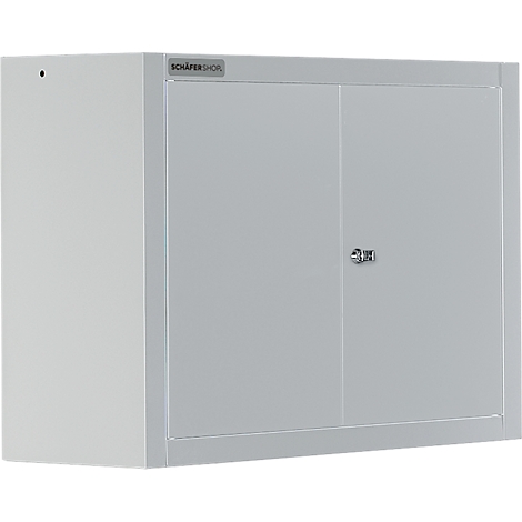 Geschweißter Wandschrank aus pulverbeschichtetem Stahlfeinblech. Flügeltür mit Schubstangen-Verschluss und Sicherheits-Zylinderschloss.