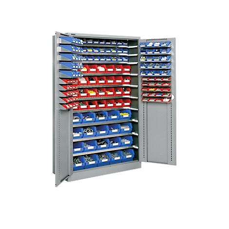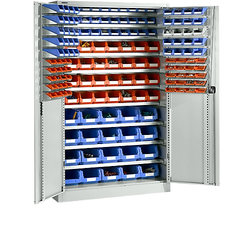 Zusätzlich bietet er eine umfangreiche, im Lieferumfang bereits mit enthaltene und farblich sortierte Ausstattung. Hierzu zählen 3 170 mm tiefe Böden, 4 220 mm tiefe Böden und 3 jeweils 330 mm tiefe Böden. Hinzu kommen 33 Lager FIX-Kästen der Serie LF 211, 32 Lager FIX-Kästen der Serie LF 221und 20 Lager FIX-Kästen der Serie LF 321.