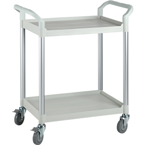 Etagen und Schiebebügel aus Kunststoff, Verbindungsrohre aus Aluminium. Mobil auf 4 Lenkrollen mit Vollgummibandage, kugelgelagert, (Ø 100 mm), grau, spurlos, 2 Rollen mit Radfeststellern.