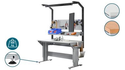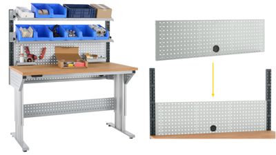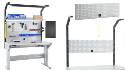 Nutzen Sie das hohe Aufbauportal, um Ihren Arbeitstisch AST31 gezielt zu erweitern. Die höhenverstellbare Werkzeuglochplatte schafft Raum für die flexible Anbringung von Haltern und Ablagen, während sich an den hohen Auslegern problemlos Schienensysteme oder Beleuchtung installieren lassen. Mit dem beiliegenden Spreizmuttersatz realisieren Sie individuelle Befestigungen und bringen weiteres Werkzeug sicher direkt an der Lochplatte an. Ideal, um den verfügbaren Raum funktional und übersichtlich zu strukturieren.
