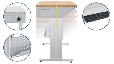 Dieser Arbeitstisch ermöglicht ergonomisches Arbeiten in jeder Lage durch eine elektrische Tischhöhenverstellung von 725 bis 1150 mm (mit Multiplexplatte von 730 bis 1155 mm). Dank Spindelhubantrieb und Synchronsteuerung bewegen Sie den Tisch komfortabel per Knopfdruck. Über die Synchronschaltung können Sie bis zu 4 Steuerungen koppeln und mehrere Tische gleichzeitig bedienen. So richten Sie größere Arbeitsflächen mühelos, schnell und exakt ein. Die Multifunktionsblende mit integriertem Lochraster und der praktische Kabelkanal sorgen zusätzlich für eine strukturierte Kabelführung und optimale Ordnung am Arbeitsplatz.