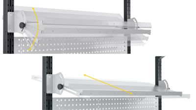 Der flexible Verstellboden sorgt für optimalen Zugriff auf Materialien und Werkzeuge und lässt sich im direkten Blickfeld zwischen den Auslegern des Arbeitstisches montieren. Mit einer stufenlosen Tiefen- und Neigungseinstellung sowie einer praktischen Rastfunktion bei 0°, 15°, 30° und 45° behalten Sie alles griffbereit und geordnet. Besonders gut geeignet für Sichtlagerkästen der Serien LF 321, 322 und 421.