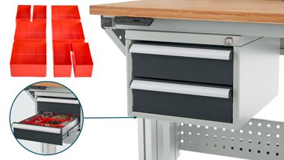 Ergänzen Sie Ihren Arbeitstisch AST31 mit dem robusten Unterbau-Schubladenblock. Zwei geräumige Schubladen auf kugelgelagerten Teleskopschienen mit Vollauszug machen Schluss mit Suchen: Alle Arbeitsmaterialien sind sofort zur Hand – übersichtlich verstaut und direkt zugänglich. Und mithilfe der optionalen Einsatzkästen aus ABS-Kunststoff organisieren Sie Ihre Kleinteile noch übersichtlicher und strukturierter.