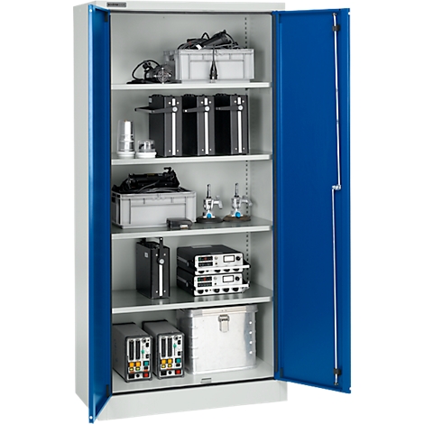 Die Flächen des Stahlschranks tragen bis zu 50 kg. Alltagswerkzeuge, Labormaterialien und Kanister mit Flüssigkeiten können sicher verstaut werden