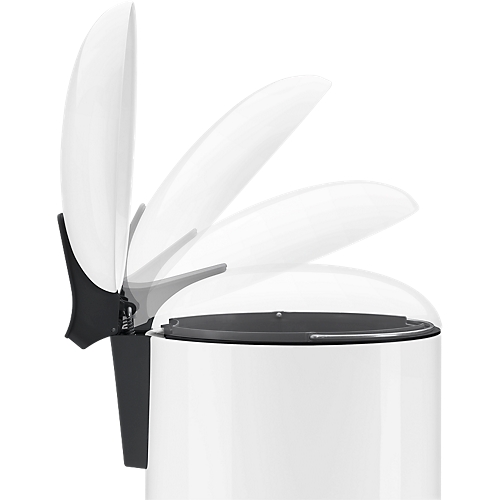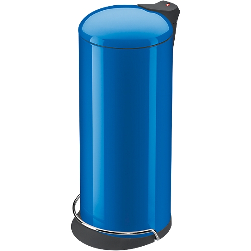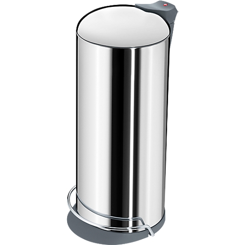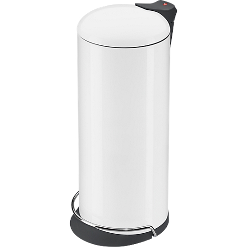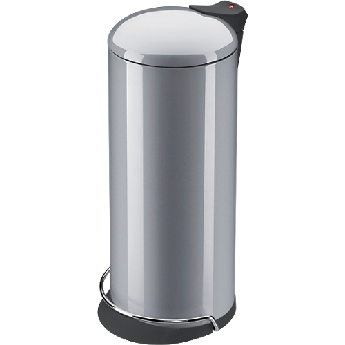 Abfallsammler in sehr eleganter Form und mit neuartigem Klemmring-System, so dass der Müllbeutel von außen nicht zu sehen ist, Aus beschichtetem Stahlblech oder Edelstahl mit innenliegender Tretmechanik. Deckel mit Geräuschsdämfungs-Clip, d.h. der Deckel schließt leise und dicht. Inneneimer feuerfest verzinkt, ca. 26 Liter.